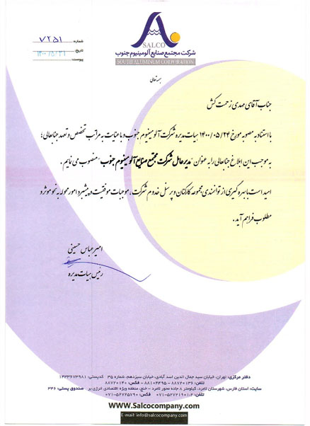 انتصاب جناب آقای مهندس مهدی زحمتکش به عنوان مدیرعامل مجتمع صنایع آلومینیوم جنوب